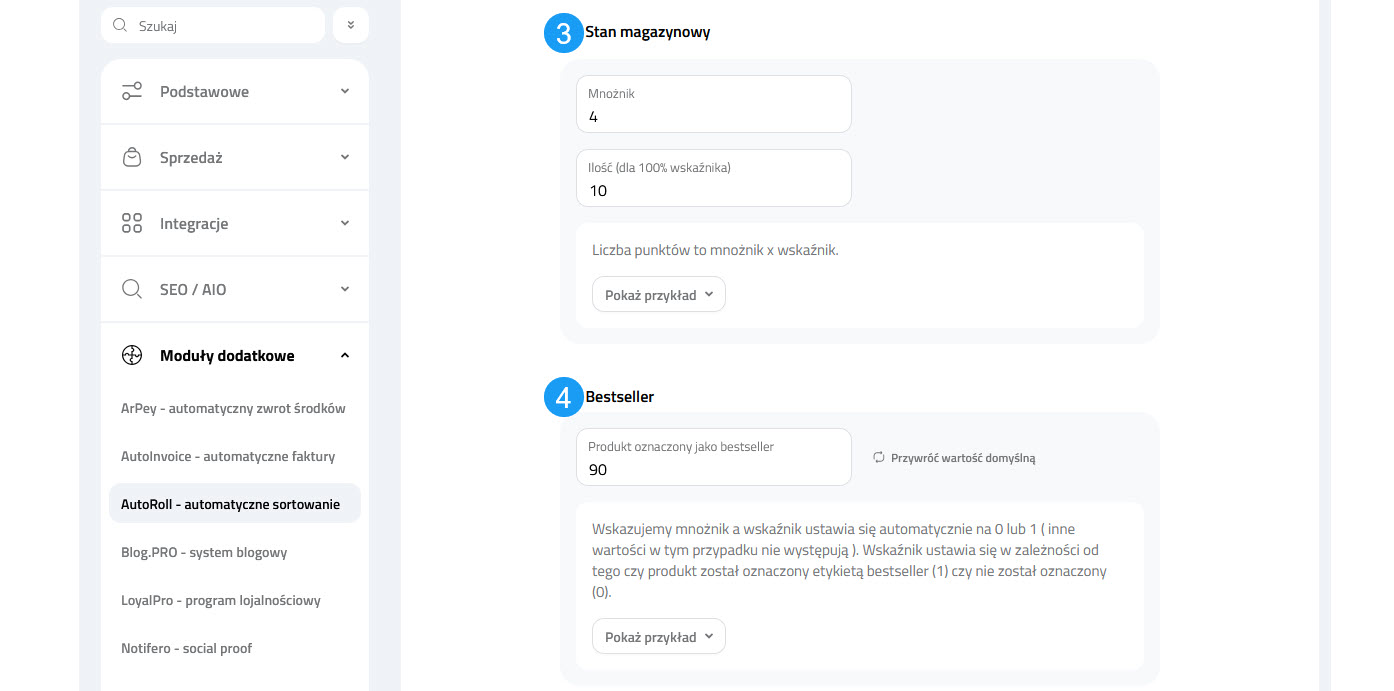 Załóżmy, że pojedynczy produkt posiada na stanie 22 szt., wtedy otrzymujemy wskaźnik na poziomie 1,0 ( = 20 szt. ( bierzemy maksymalną ustaloną wartość ) / 20 szt. ), a po podstawieniu mnożnika w wysokości 4, produkt otrzymuje 4 punkty ( = 1,0 x 4 )