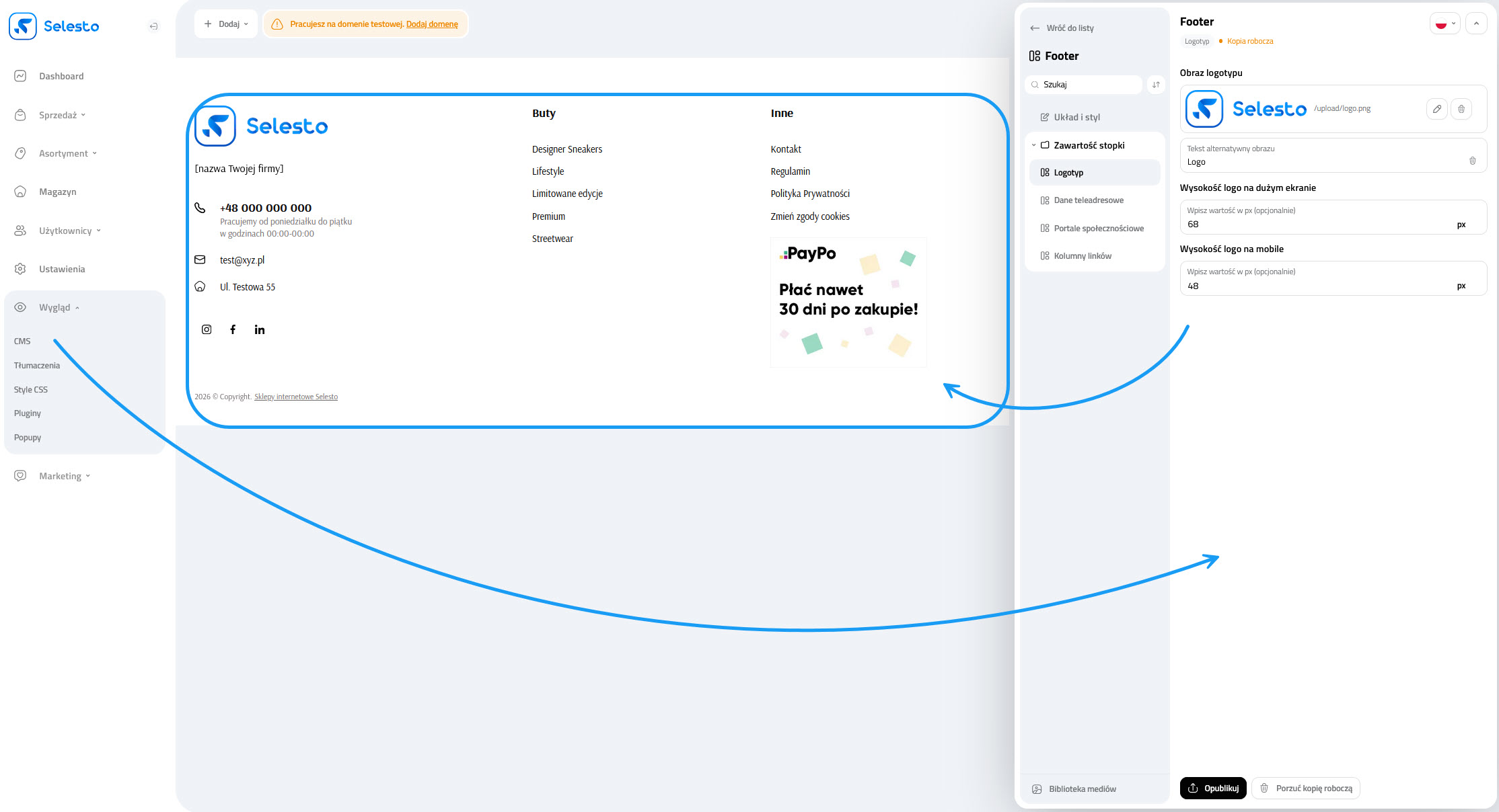 W sekcji Logotyp dodasz lub podmienisz logo widoczne w stopce sklepu oraz ustawisz jego wysokość osobno dla dużych ekranów i mobile. Możesz też uzupełnić Tekst alternatywny obrazu, aby stopka była bardziej dostępna i czytelna. Dzięki temu logo będzie wyglądać poprawnie niezależnie od urządzenia.