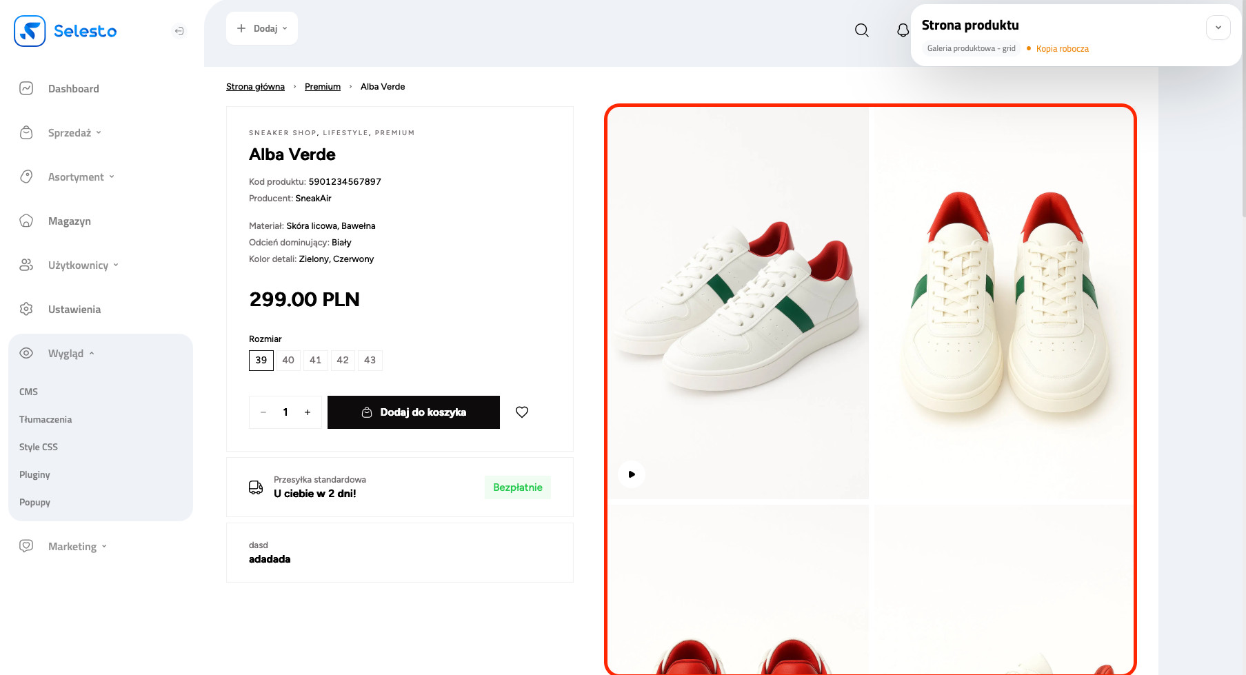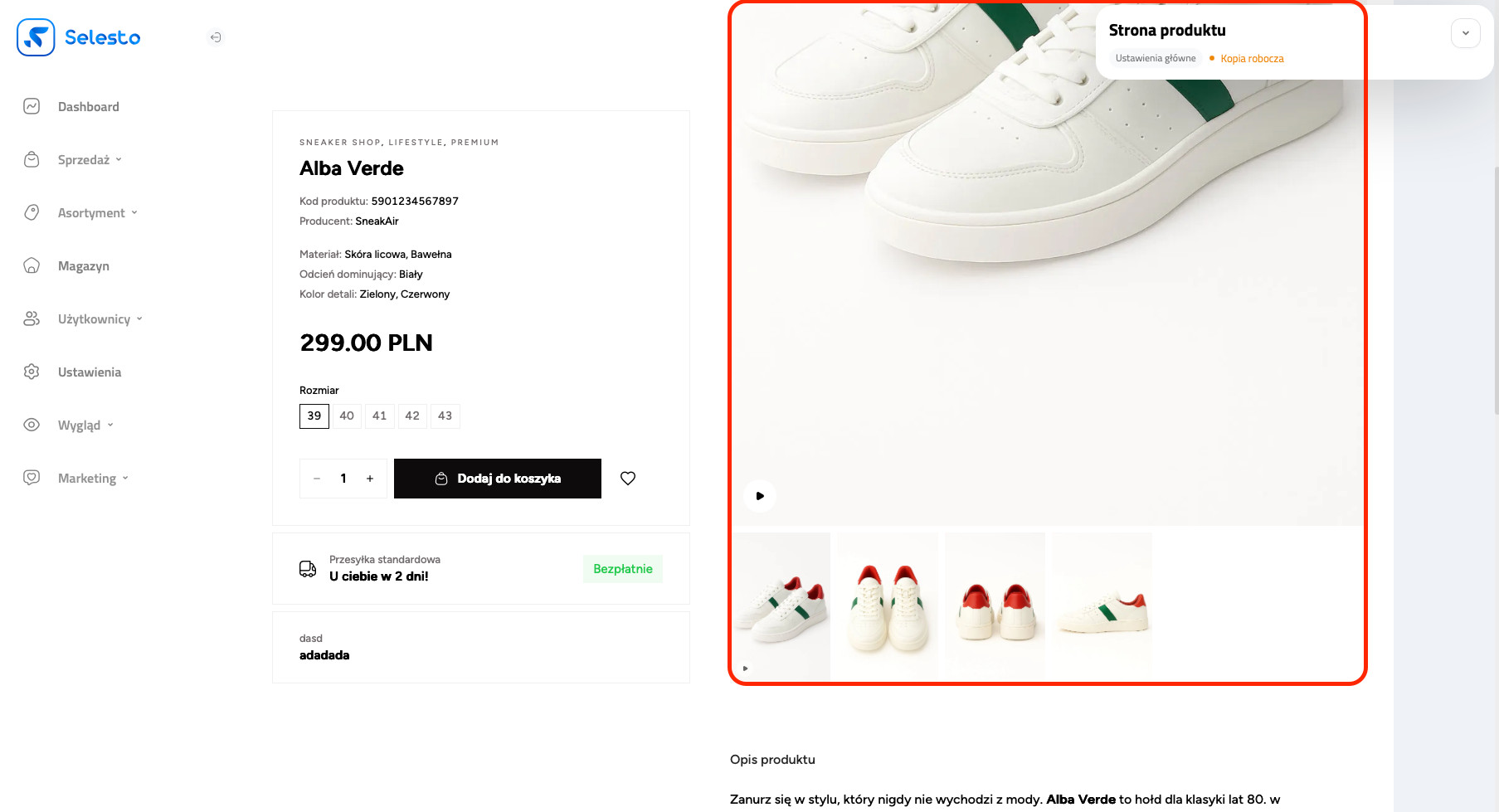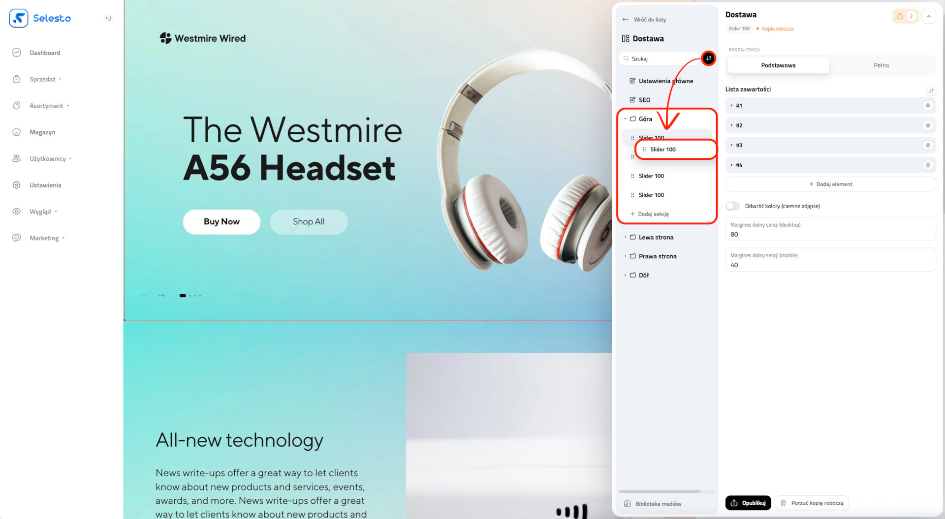 Jak widać Użytkownik może budować w Selesto całkowicie dedykowane strony, składając je z predefiniowanych sekcji (podobnie jak układa się klocki). Aby tego dokonać należy: