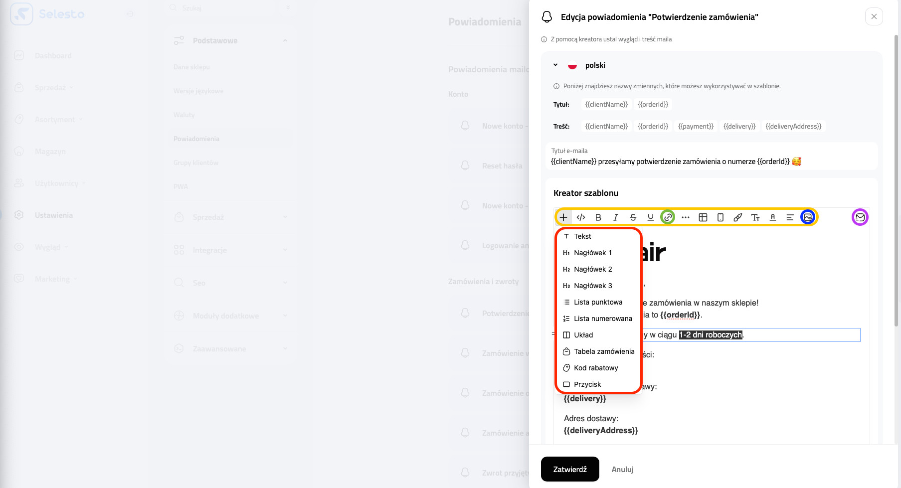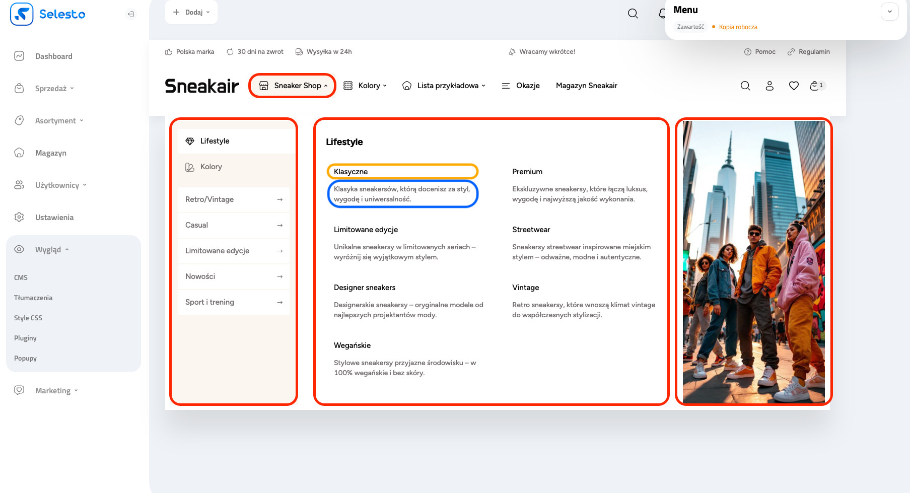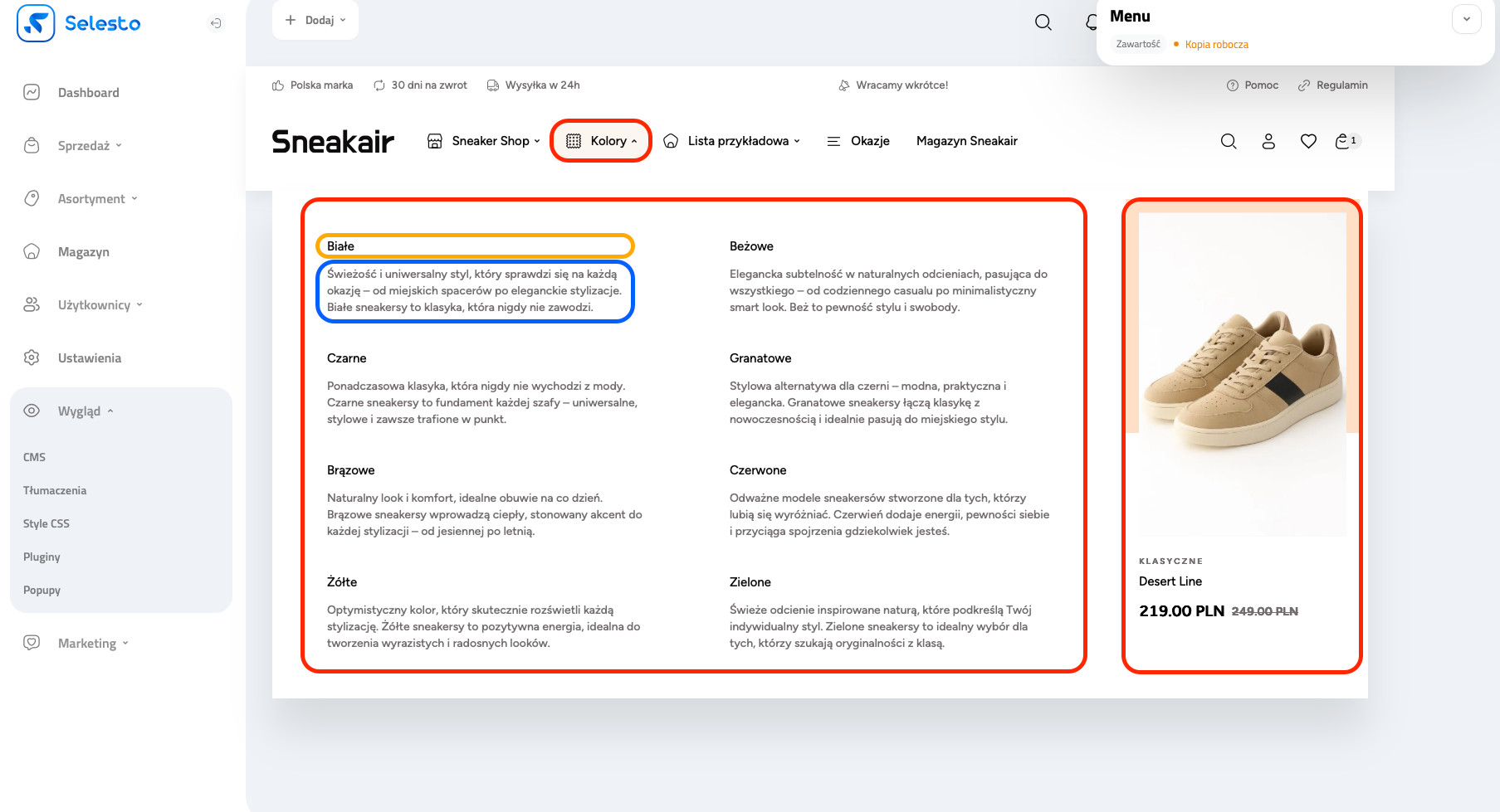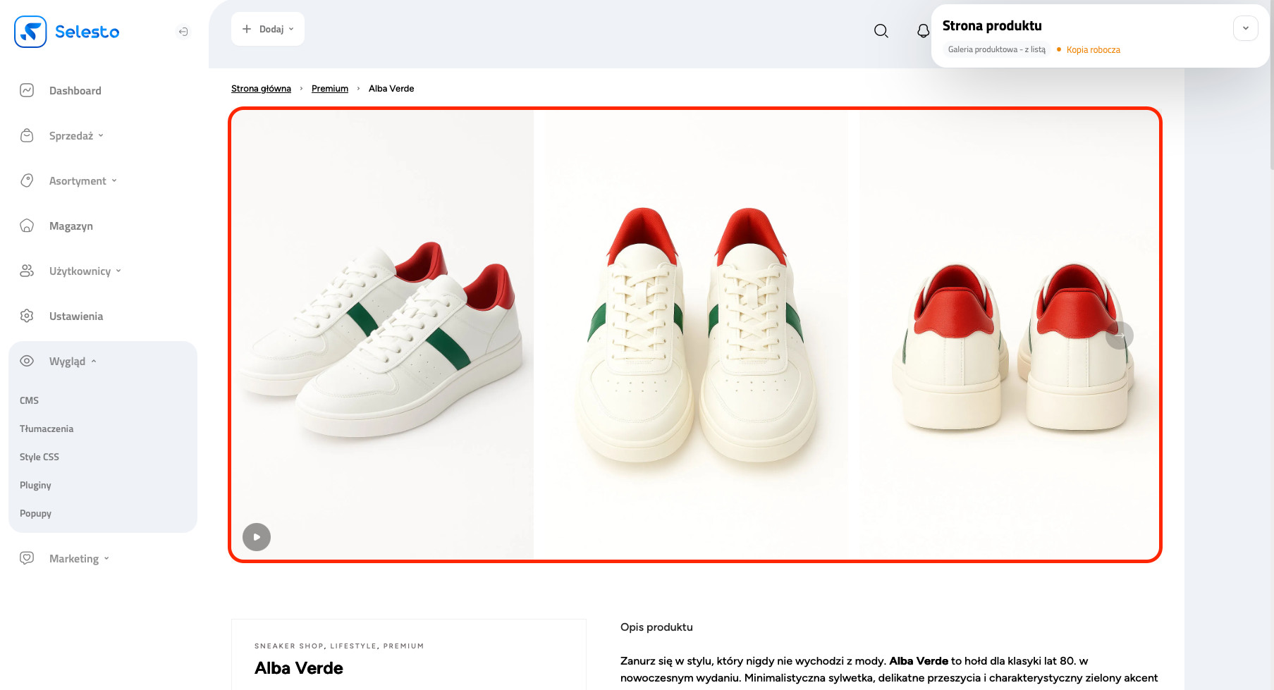 Jak widać Użytkownik może budować w Selesto całkowicie dedykowane strony, składając je z predefiniowanych sekcji (podobnie jak układa się klocki). Aby tego dokonać należy: