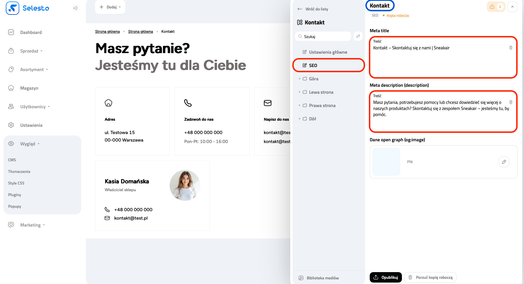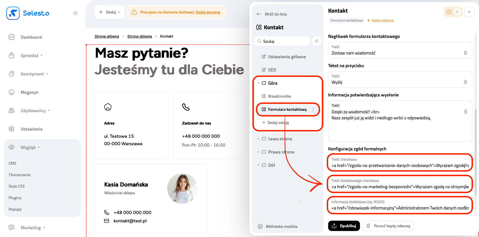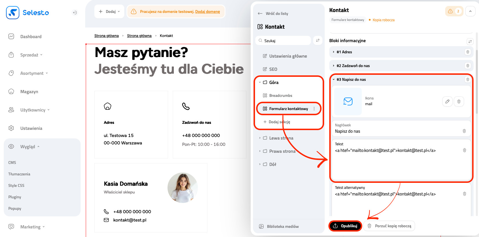W nowej wersji Selesto Użytkownik otrzymuje możliwość budowania własnych dedykowanych stron na bazie predefiniowanych sekcji. Poniżej prezentujemy stronę kontakt, która została wbudowana w szablon sklepu jako przykład. Aby zmodyfikować jej treść należy standardowo wejść w tryb edycji strony, zmienić jej zawartość, a następnie opublikować zmiany.
