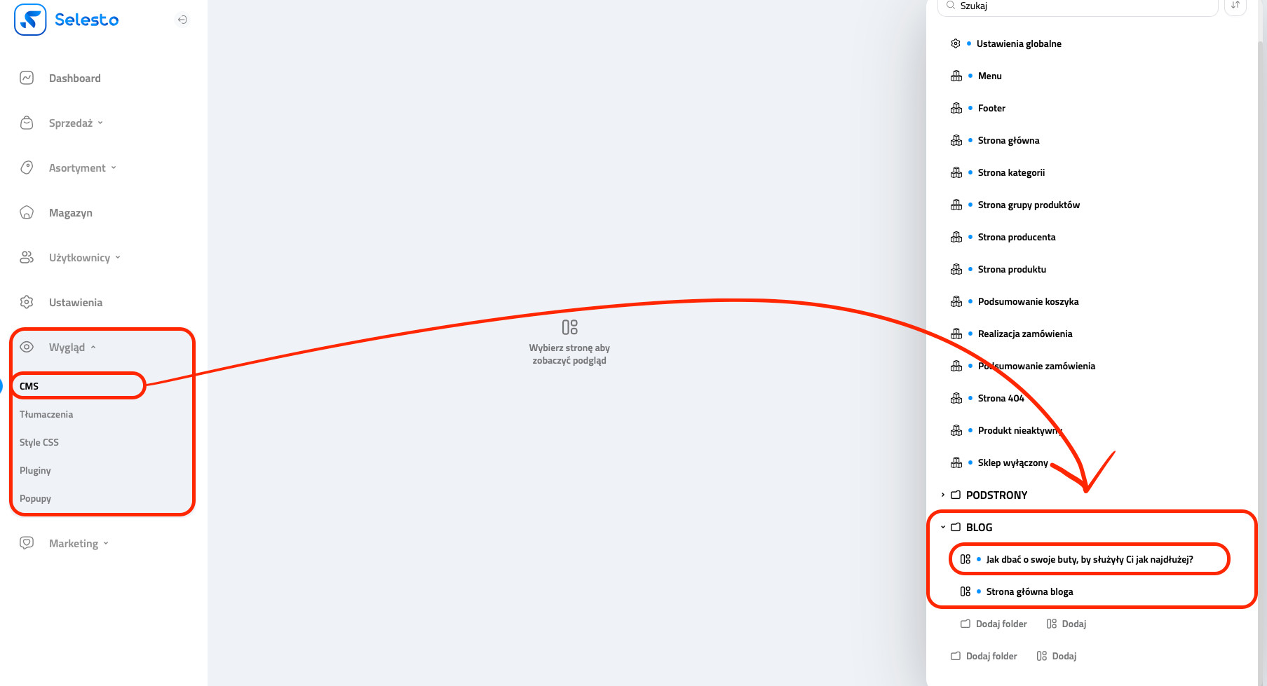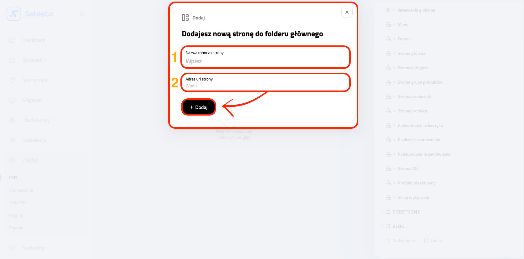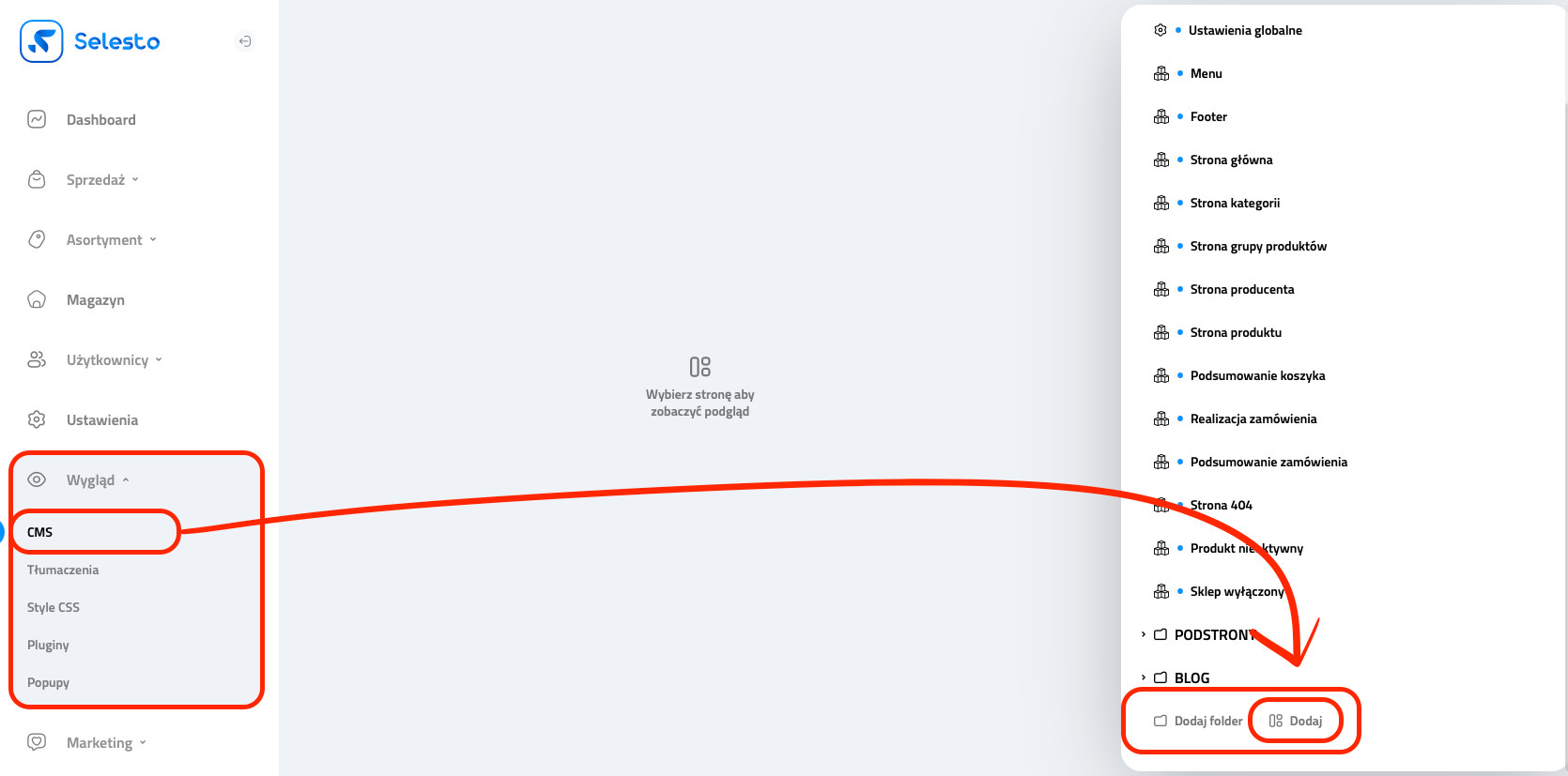 Wybrać przycisk: "Wygląd", a następnie: "CMS" oraz przejść do listy elementów i stron znajdujących się po prawej stronie ekranu. W tym miejscu należy wybrać przycisk "Dodaj", poprzez który można utworzyć nową stronę: