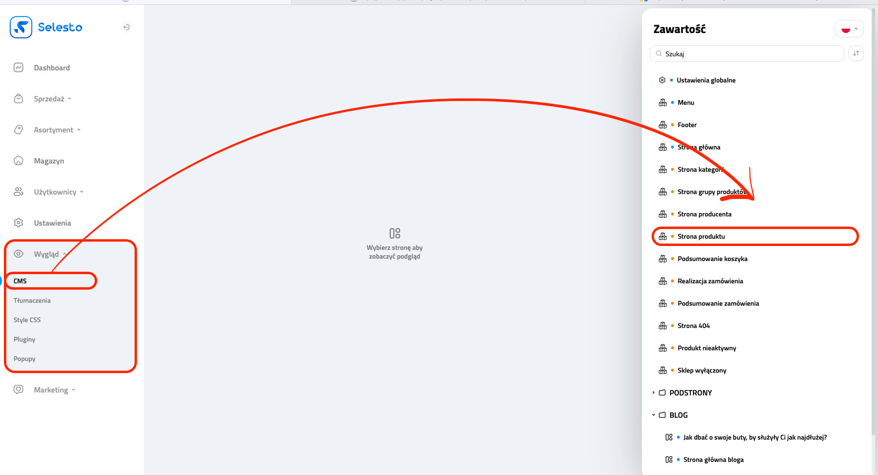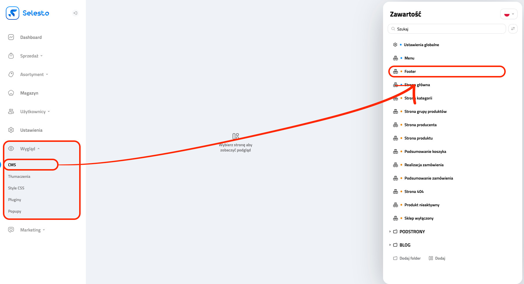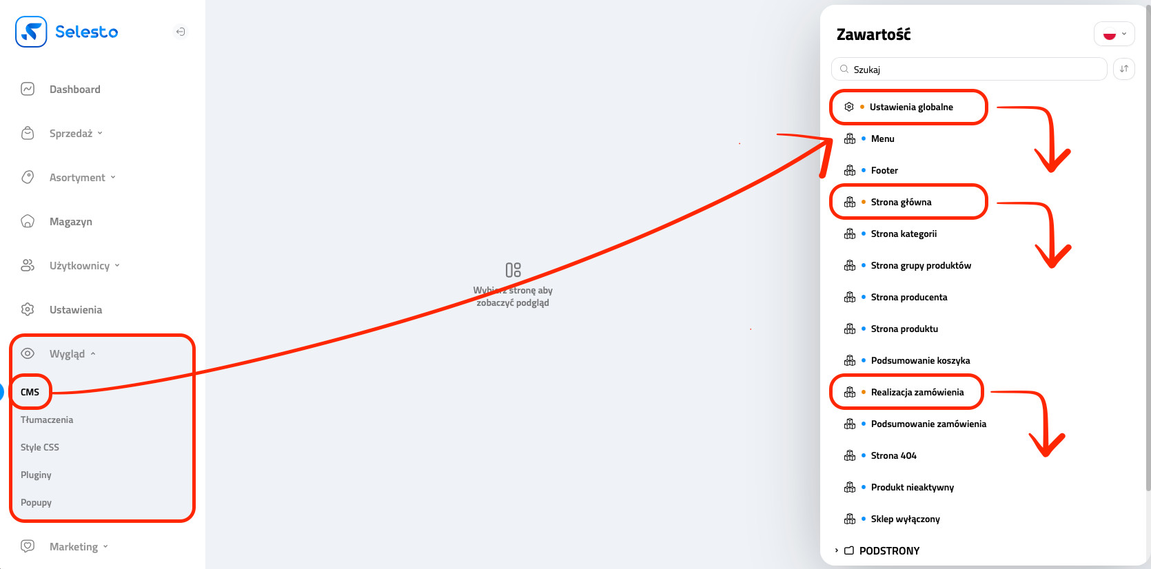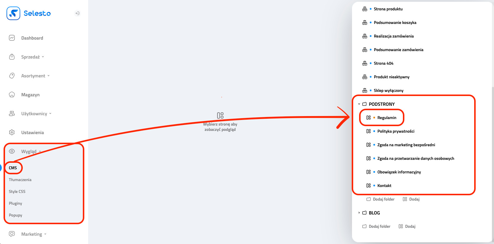 Wybrać przycisk: "Wygląd", a następnie: "CMS" oraz przejść do listy elementów i stron znajdujących się po prawej stronie ekranu. W tym miejscu należy wybrać przycisk "Dodaj", poprzez który można utworzyć nową stronę: