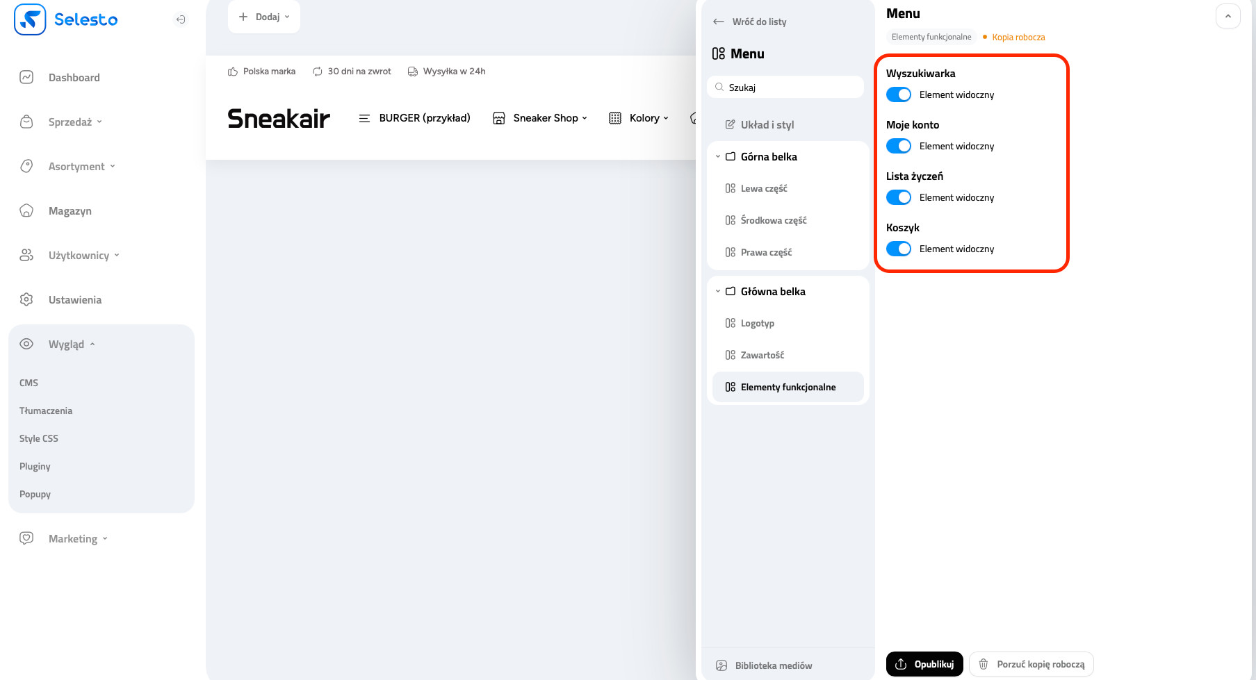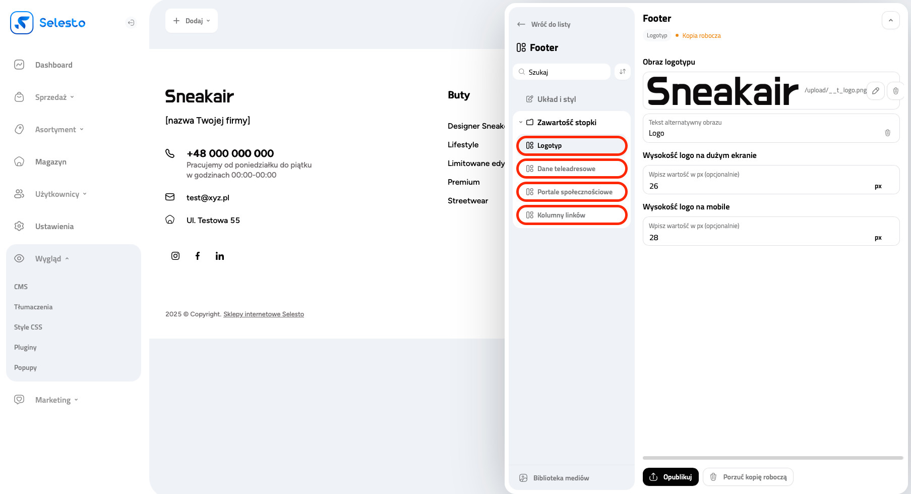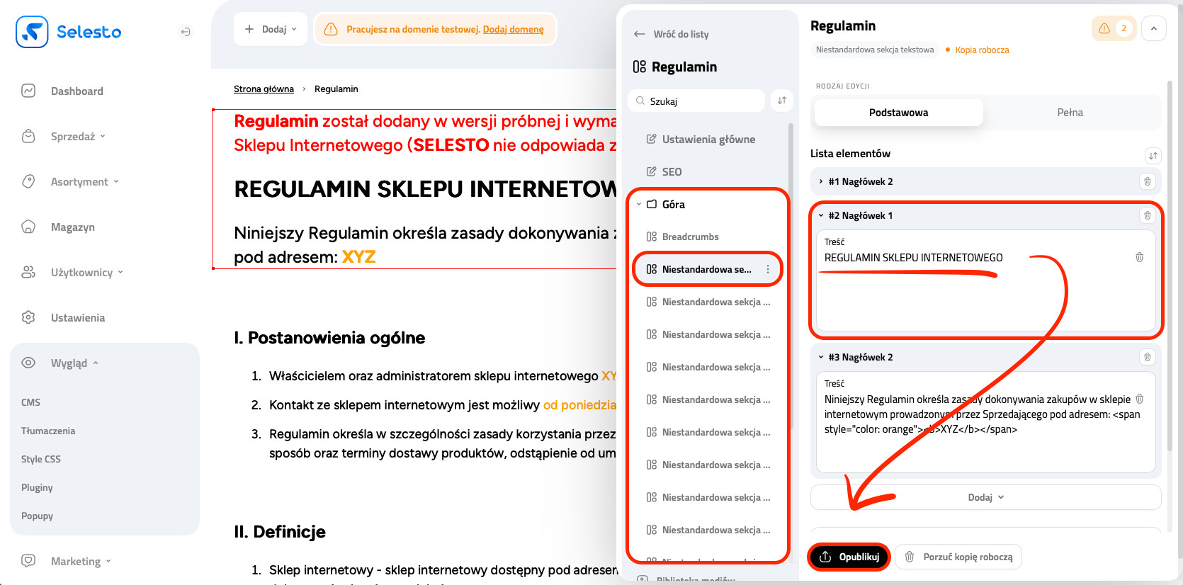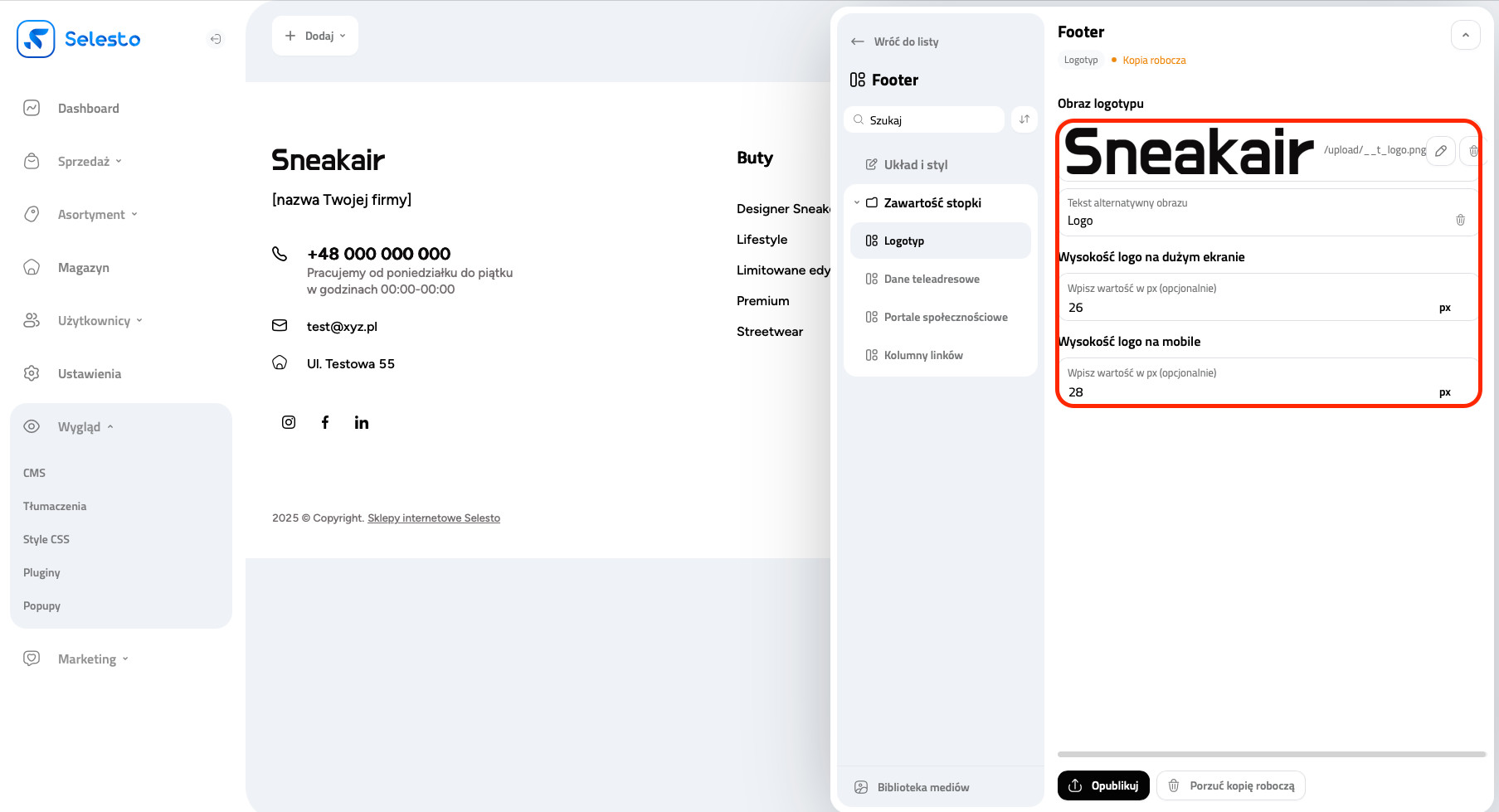 Po zakończeniu pracy należy pamiętać aby opublikować wprowadzone zmiany poprzez przycisk "Opublikuj". Dopóki zmiany nie zostaną opublikowane nie będą się wyświetlać na zewnątrz, tzn. zmiany będą widoczne wyłącznie w panelu administracyjnym sklepu.