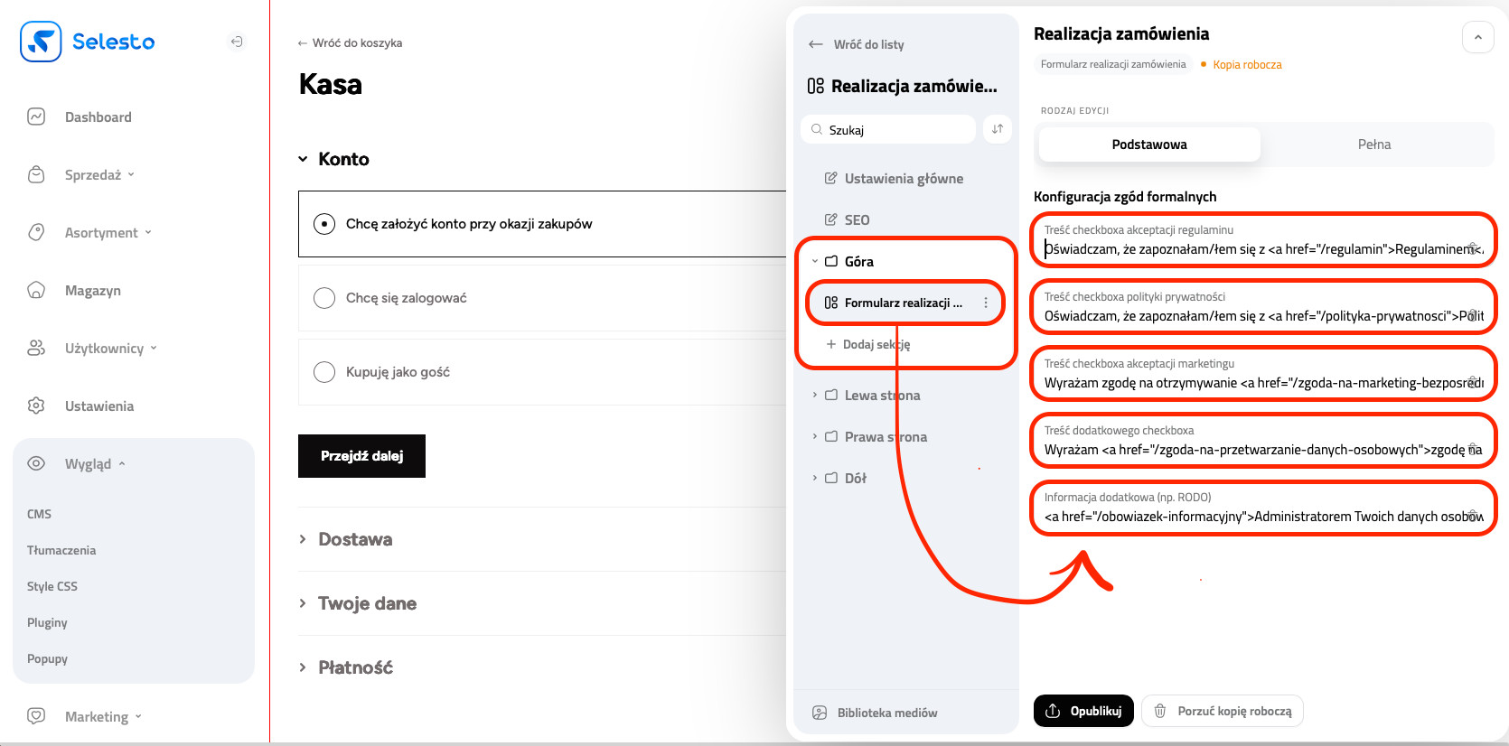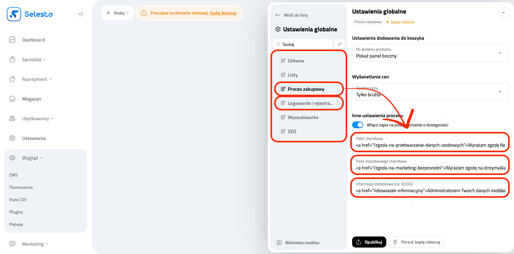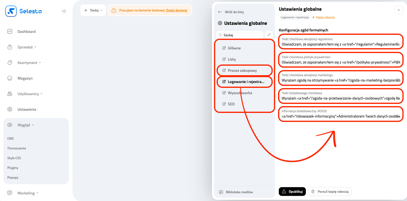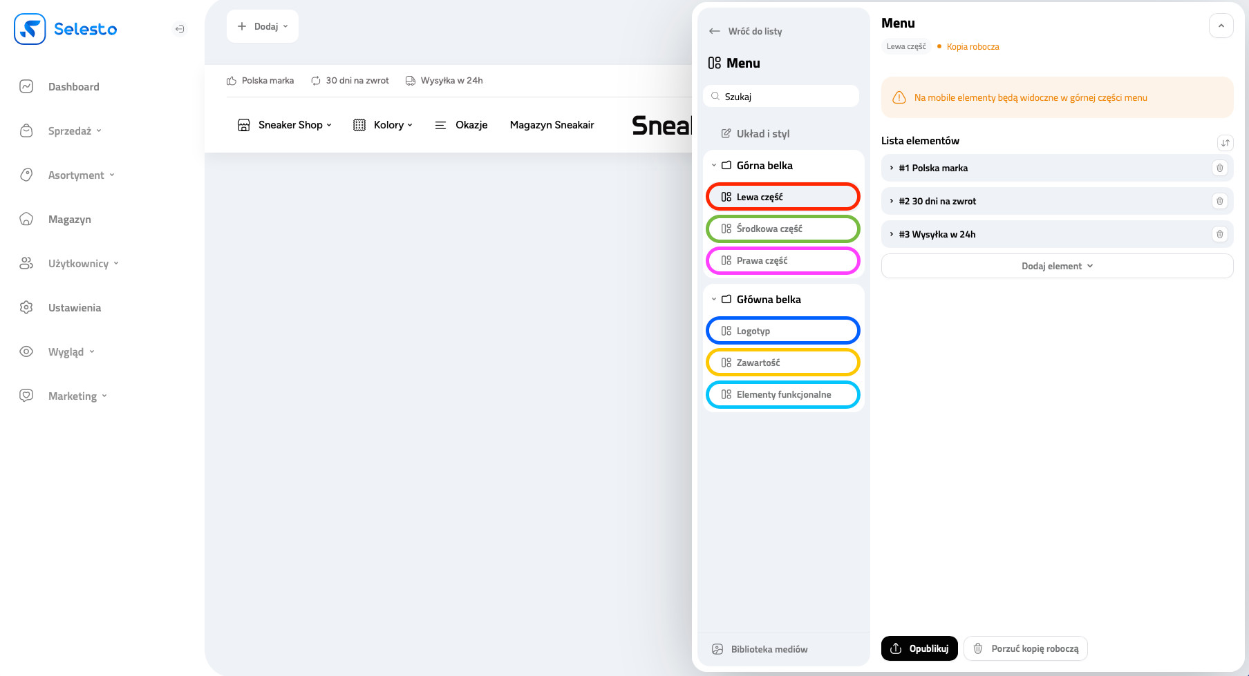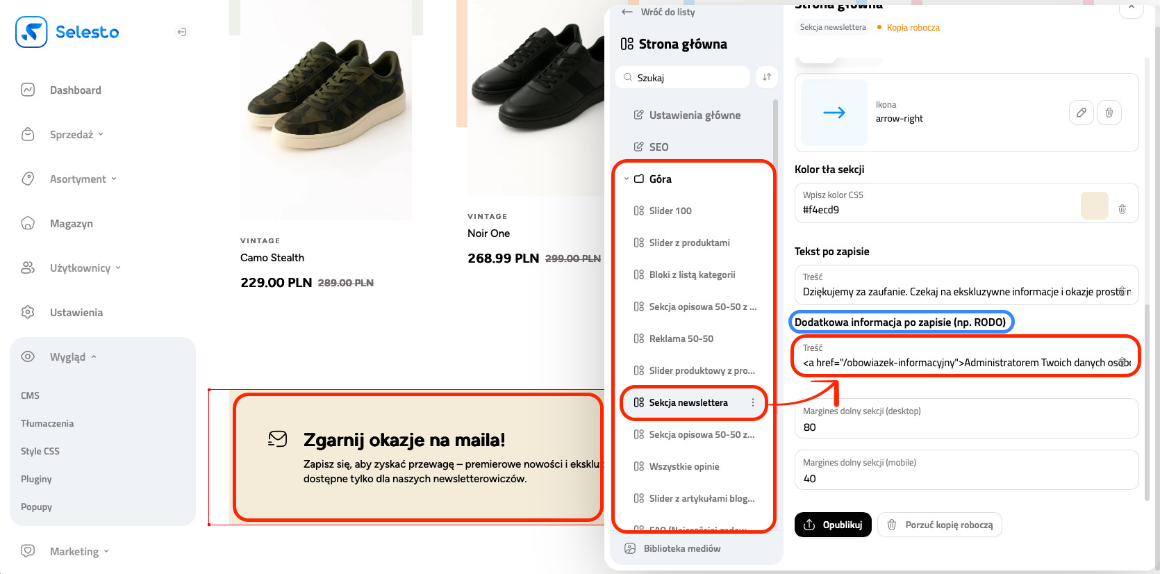 Po zakończeniu pracy należy pamiętać aby opublikować wprowadzone zmiany poprzez przycisk "Opublikuj". Dopóki zmiany nie zostaną opublikowane nie będą się wyświetlać na zewnątrz, tzn. zmiany będą widoczne wyłącznie w panelu administracyjnym sklepu.