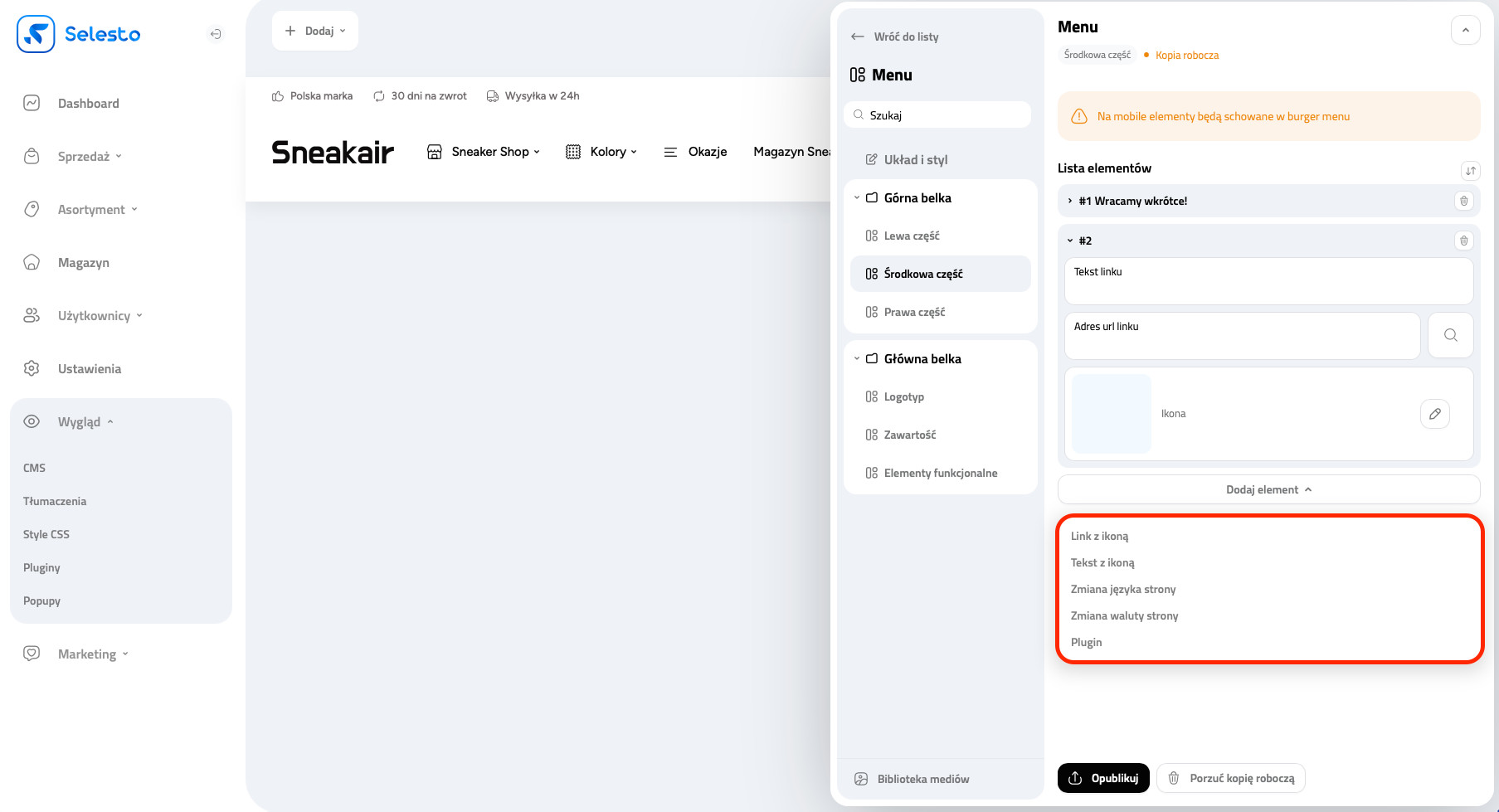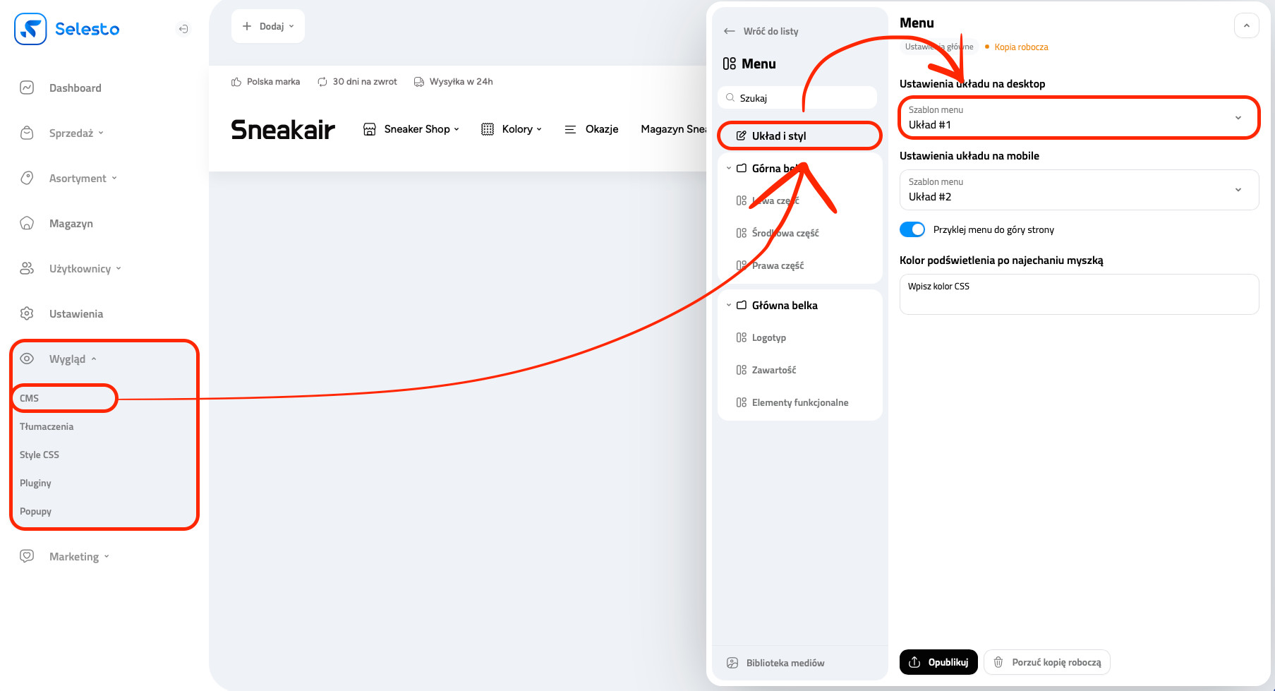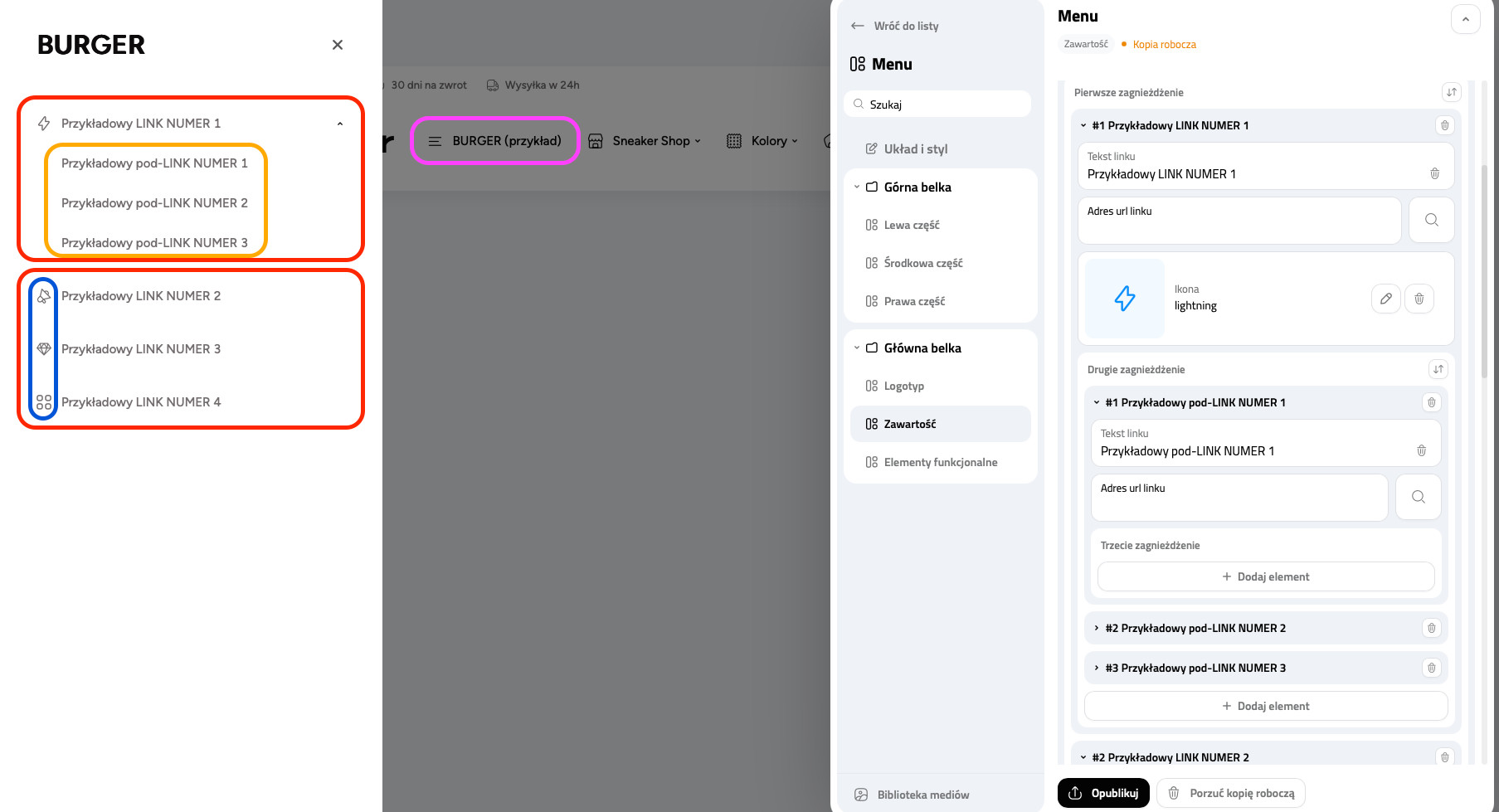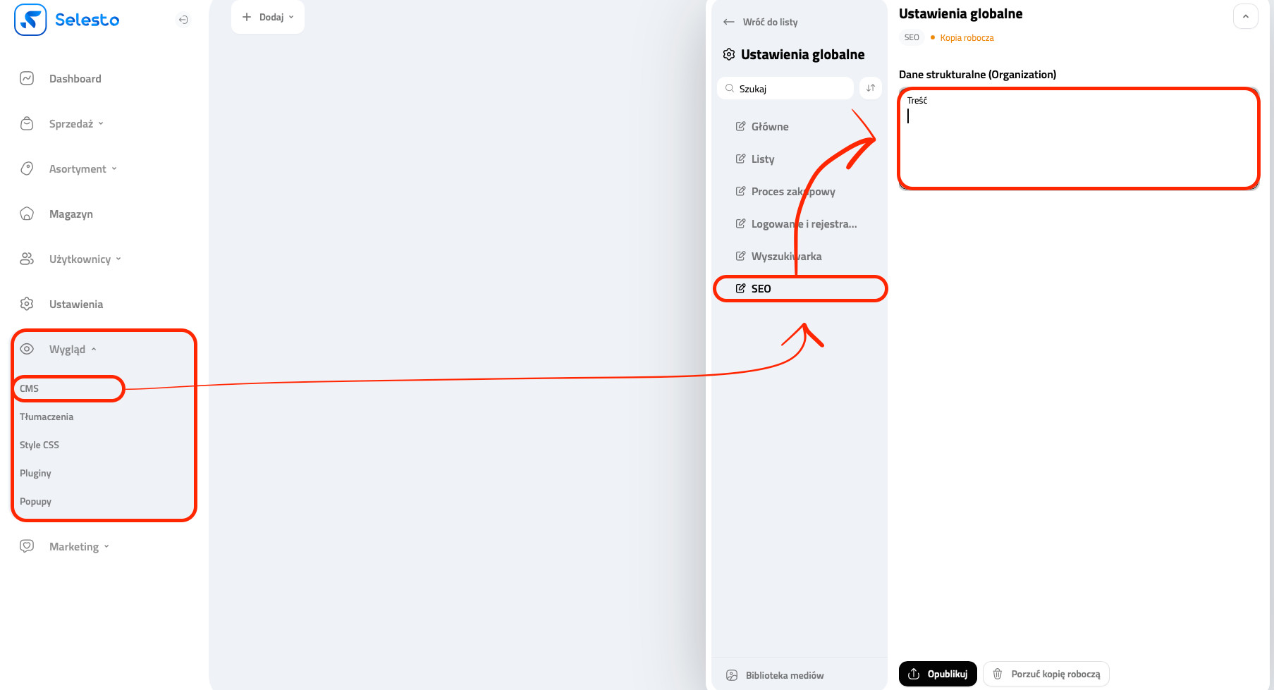 Po zakończeniu pracy należy pamiętać aby opublikować wprowadzone zmiany poprzez przycisk "Opublikuj". Dopóki zmiany nie zostaną opublikowane nie będą się wyświetlać na zewnątrz, tzn. zmiany będą widoczne wyłącznie w panelu administracyjnym sklepu.