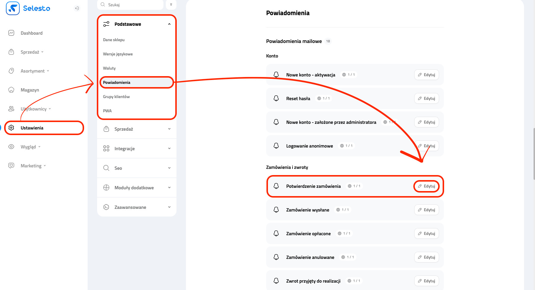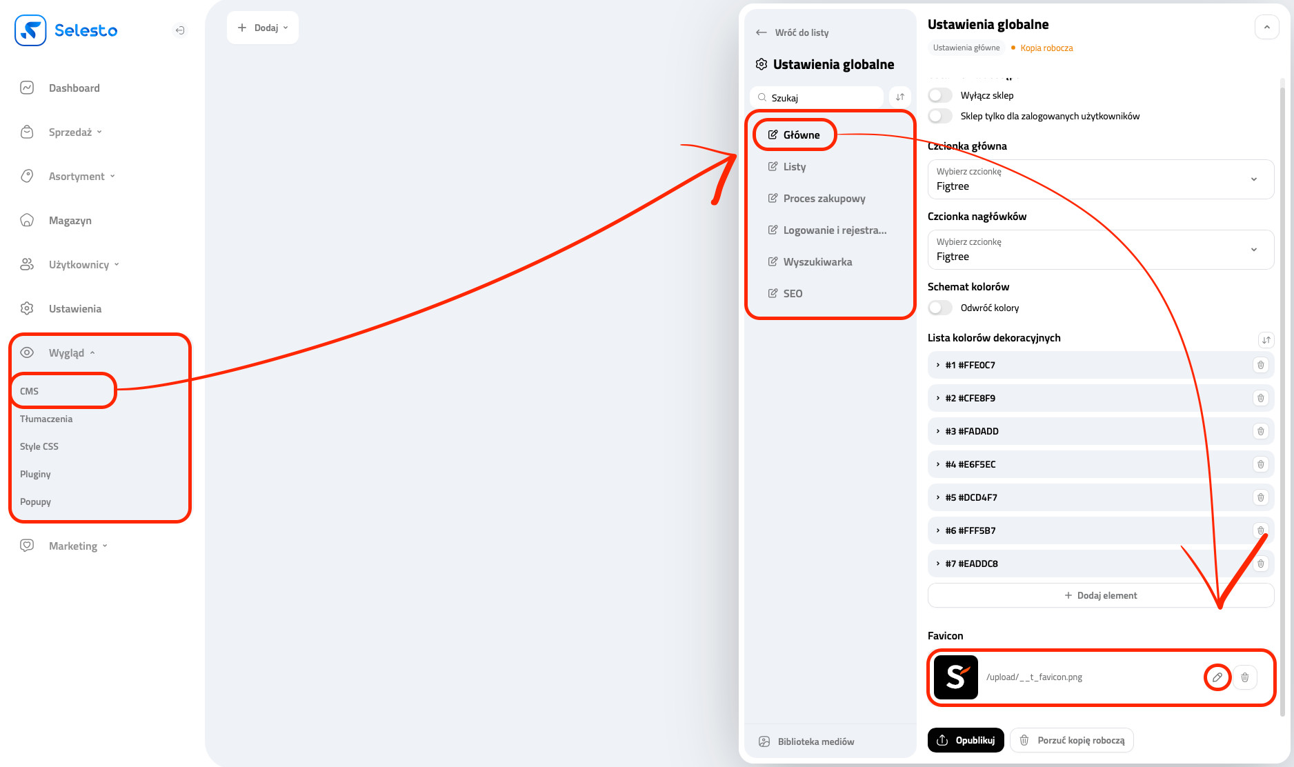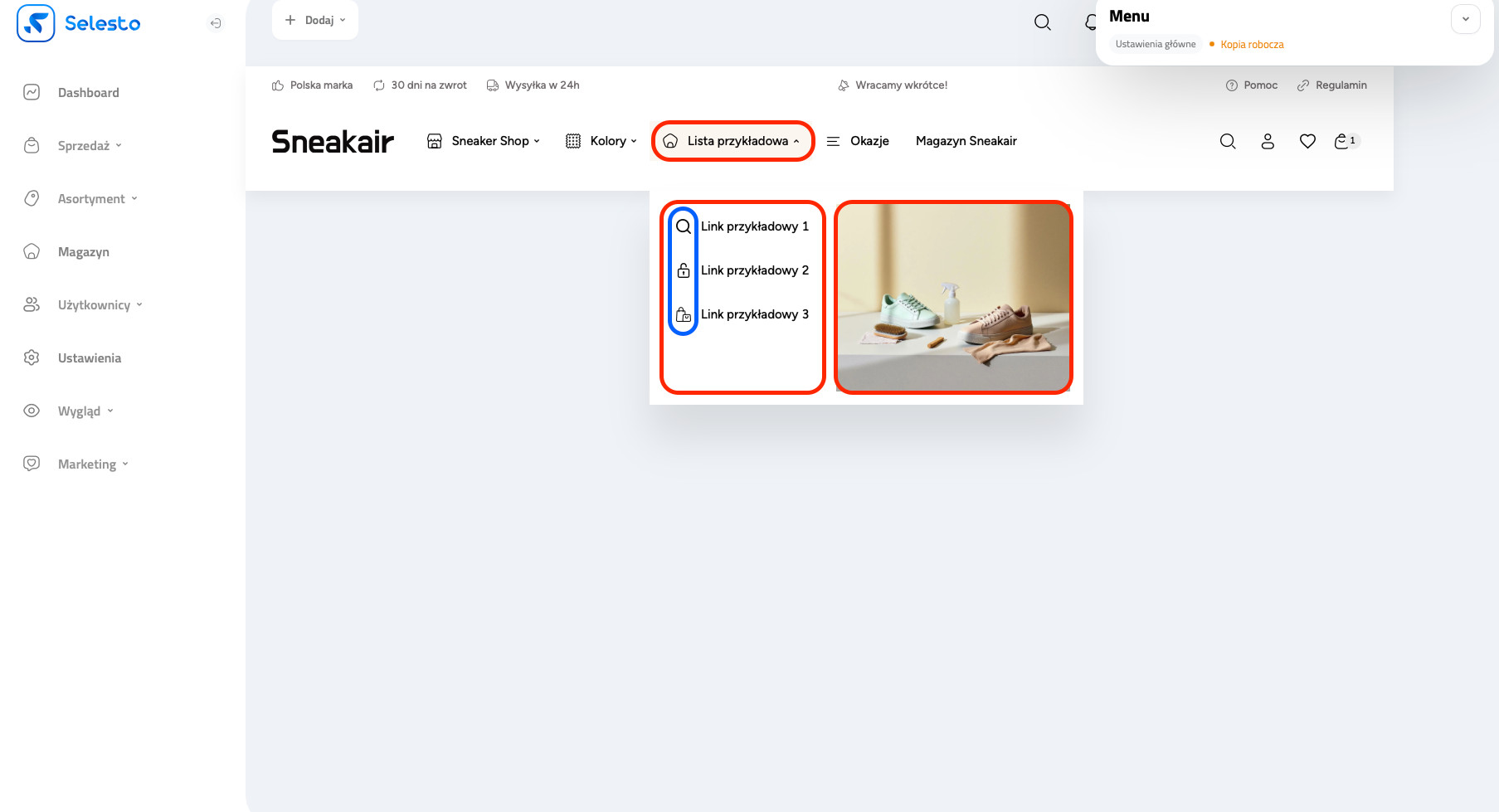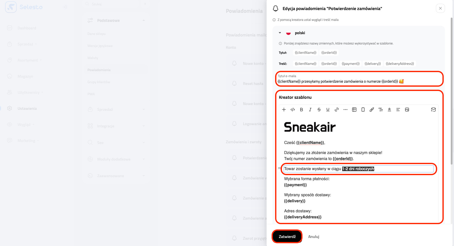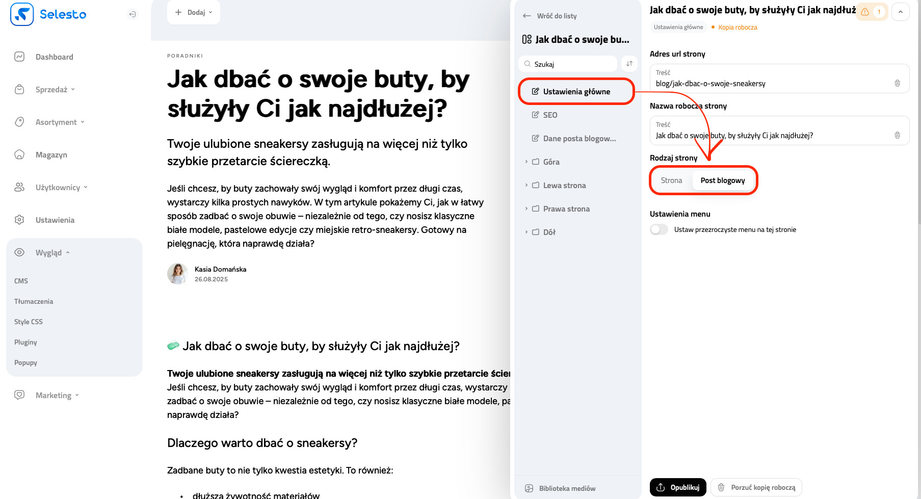 Po zakończeniu pracy należy pamiętać aby opublikować wprowadzone zmiany poprzez przycisk "Opublikuj". Dopóki zmiany nie zostaną opublikowane nie będą się wyświetlać na zewnątrz, tzn. zmiany będą widoczne wyłącznie w panelu administracyjnym sklepu.