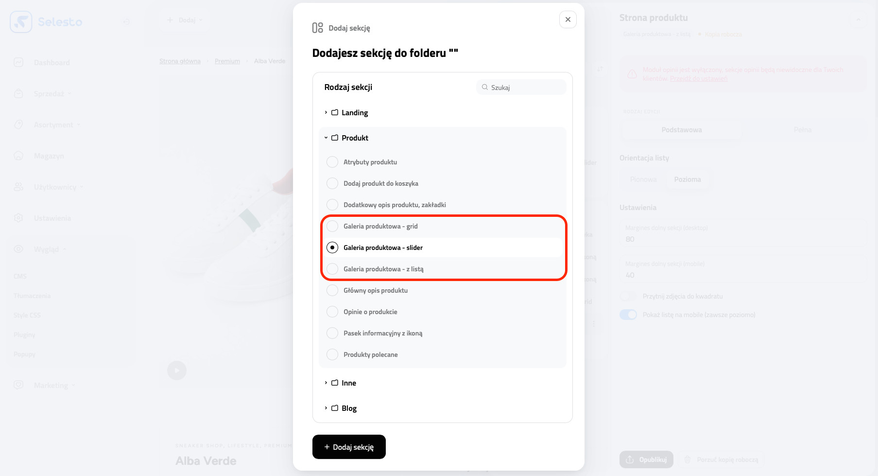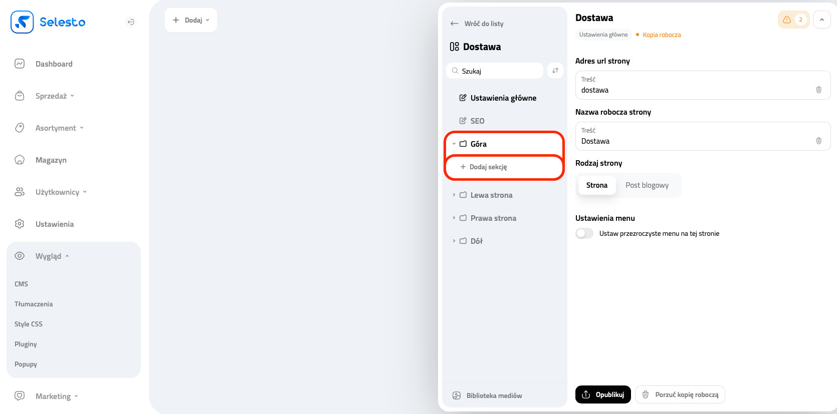 W tym celu należy rozwinąć element oraz wybrać przycisk: "Dodaj sekcję".