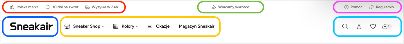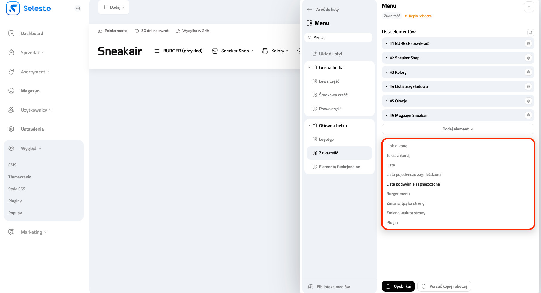 W celu szybkiego zbudowania strony najlepszym wyborem na początek będzie element Góra, na jego przykładzie zaprezentujemy jak wygląda składanie strony z sekcji.