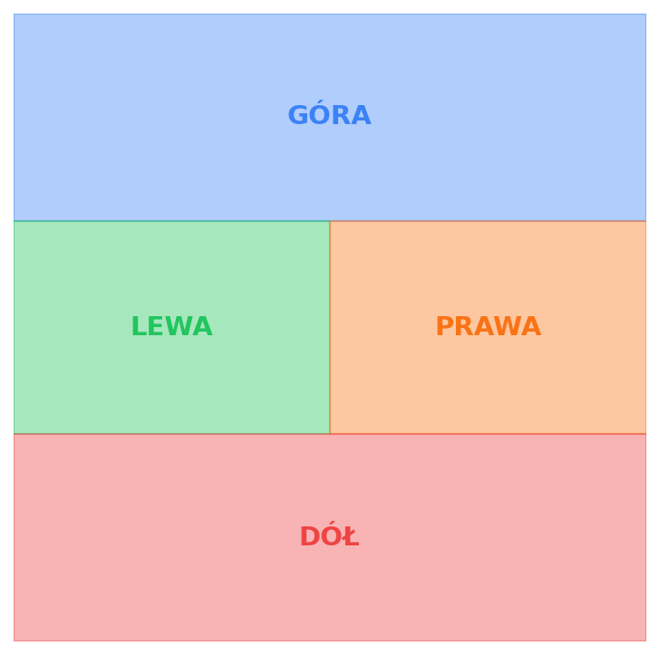 W ramach podziału: Góra, Lewa strona, Prawa strona i Dół musimy zdecydować, który z tych elementów nas interesuje (możemy użyć wszystkich). Wizualnie w celu wyobrażenia sobie logiki działania systemu podział strony polega na umieszczaniu wybranych sekcji w konkretnym elemencie (strefie), które możemy zaprezentować następująco: